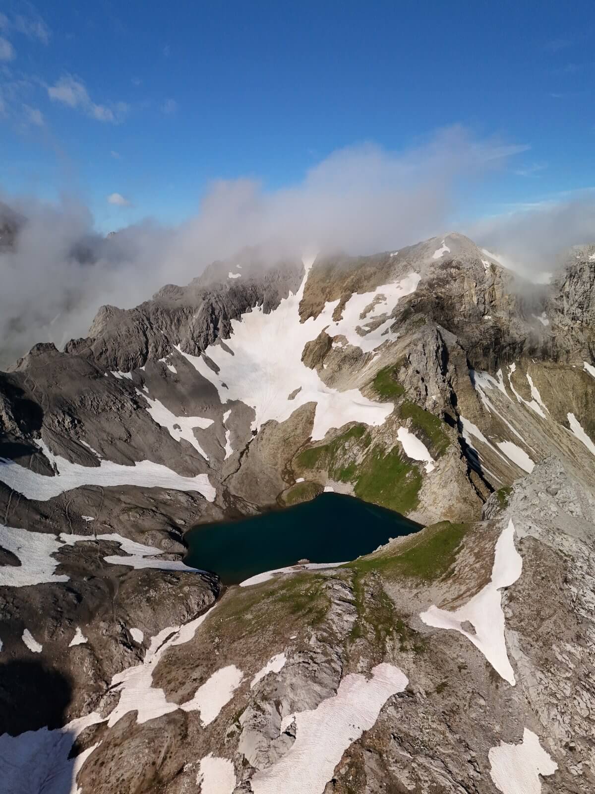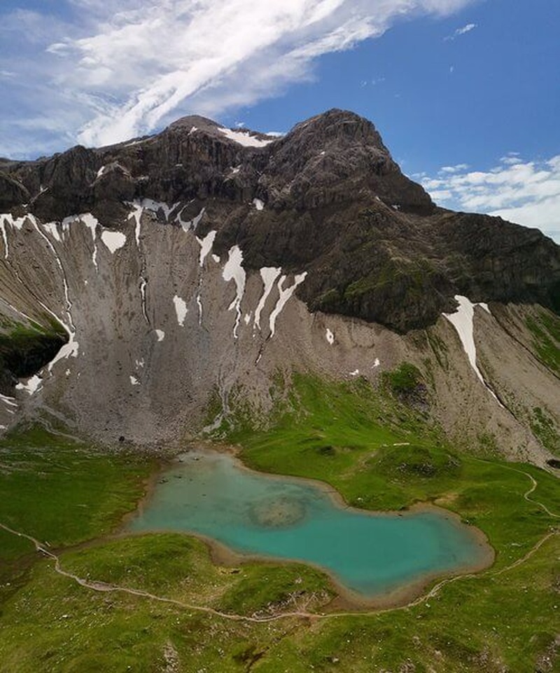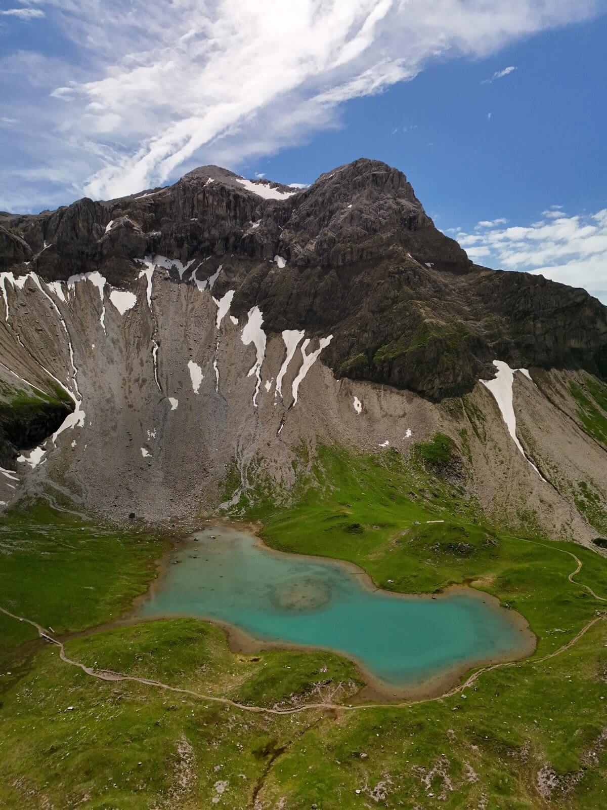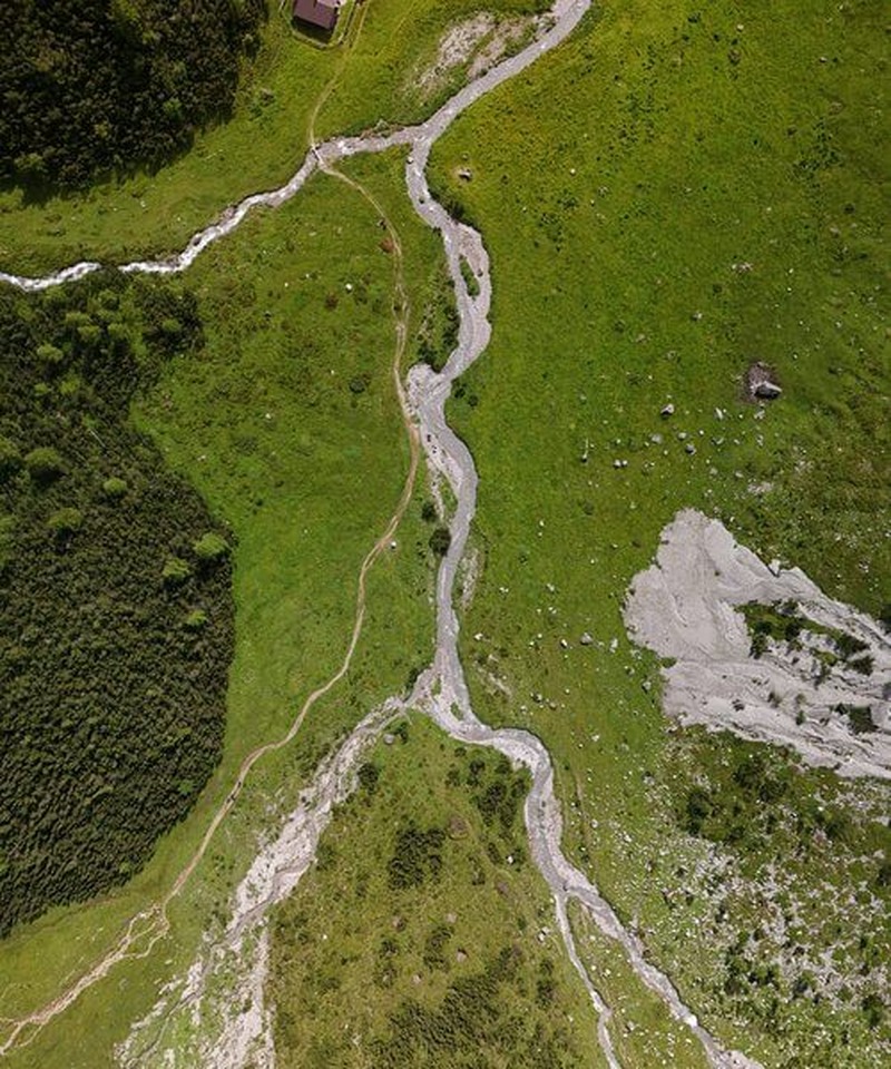 Das Parseiertal ist wild und beeindruckend. Tosende Bergbäche, Schneefelder im Juli, und Felswände, die mehrere hundert Meter senkrecht aufragen. Aus der Luft sieht man erst, wie winzig die Wanderer auf dem schmalen Pfad wirken – ein Perspektivwechsel, der die Dimension dieser Landschaft begreifbar macht.