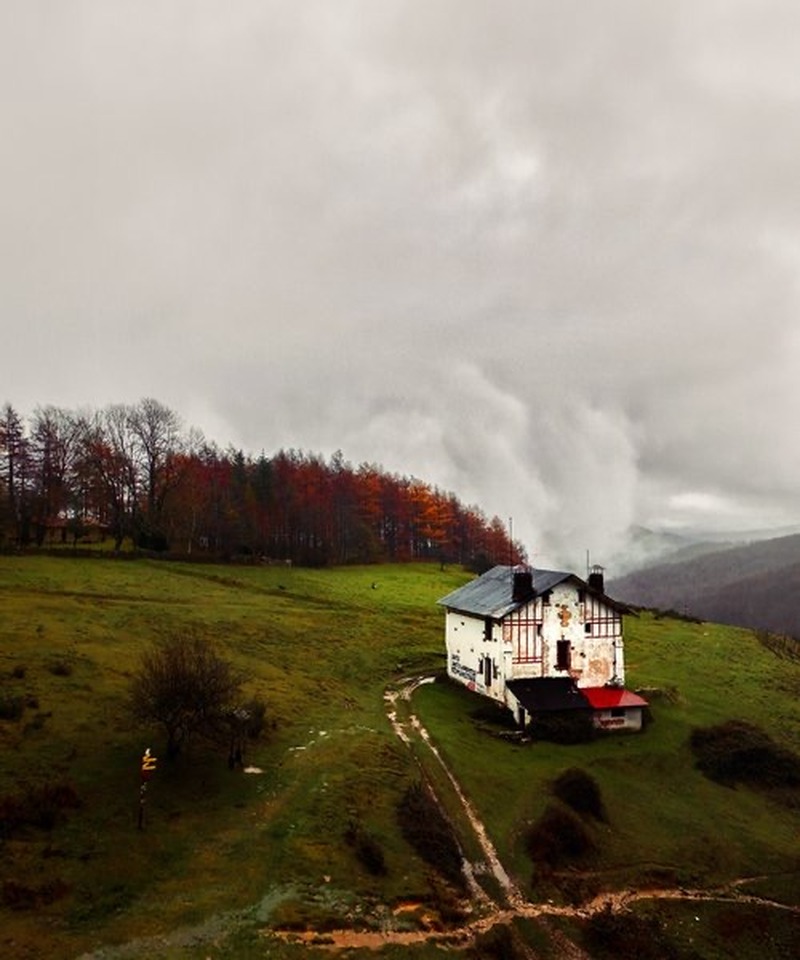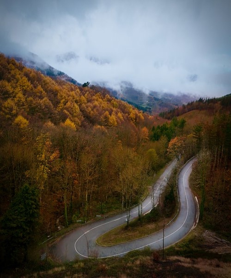Further inland, it becomes truly green. The Basque mountains are more reminiscent of Ireland than Spain. Autumn leaves, wisps of fog over the valleys, scattered Caserios (Traditional Basque farmhouses with the typical half-timbered construction). The landscape is a dream for drone photography — the winding mountain roads look fantastic photographed from above.